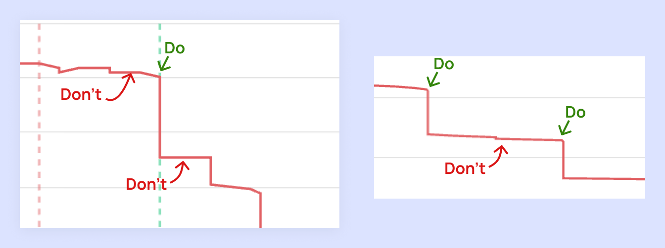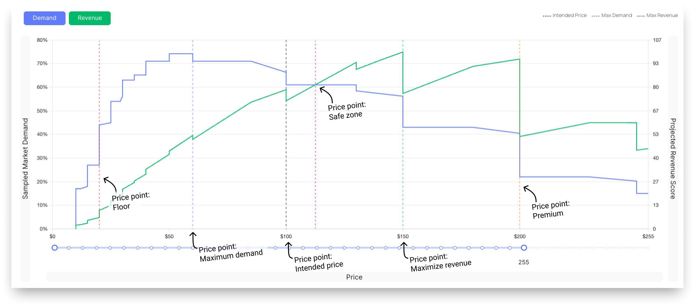 Price right before price walls - never in the middle of a plateau. The demand line shows steps. Significant steps indicates price walls — specific price points where a large number of potential customers decide the product is too expensive. To maximize sales, you should price your product at the highest point before the next price wall, not in the middle of a demand plateau. This captures the most revenue from the current demand step.
