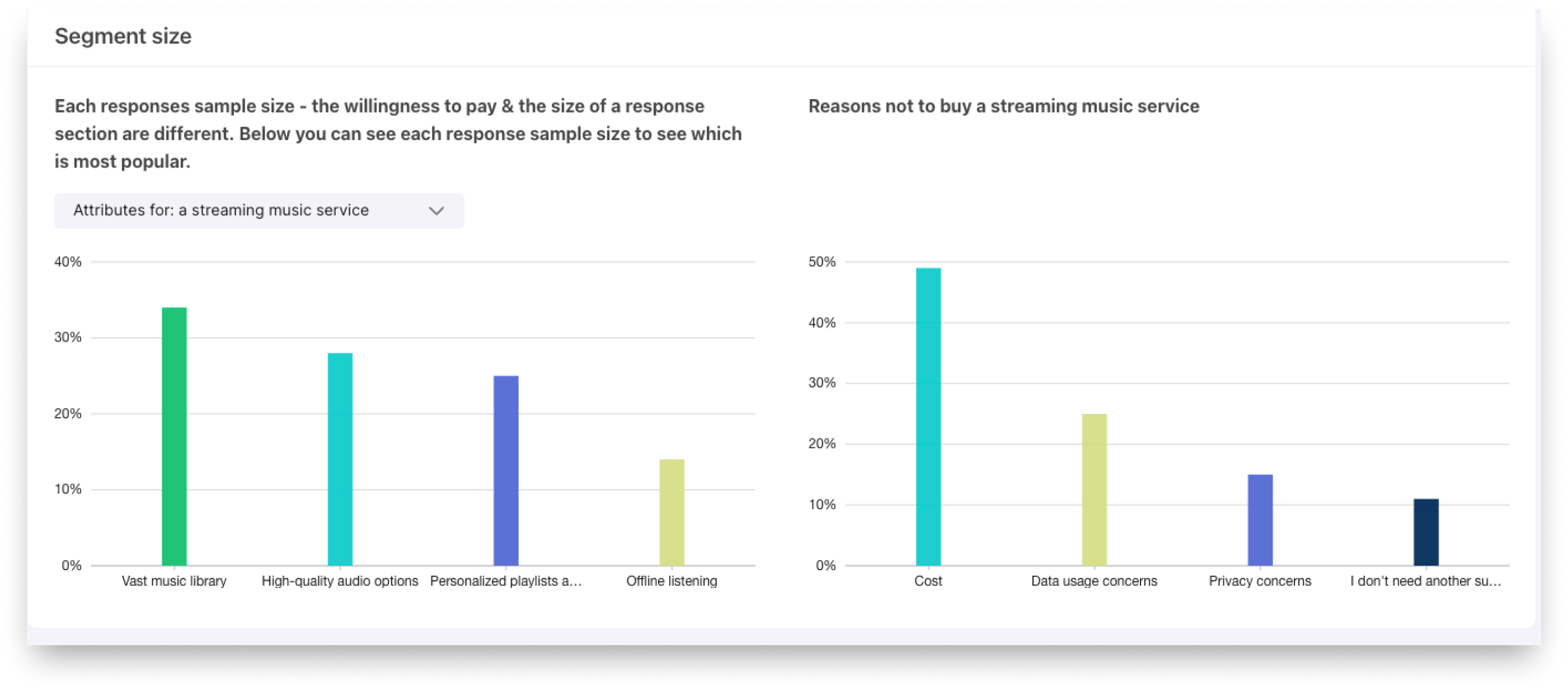 We use segmentation analysis to break down the total audience into smaller, more focused groups. We then use a drill-down approach to analyze each group in detail. This process lets us see how different attributes, features, or messages affect willingness to pay for specific segments. Instead of a single, broad view of the market, you get a clear, granular picture of what matters to each audience. For example, some customers may value a product's high-quality materials, while others are more influenced by its sustainability features. We find those drivers.